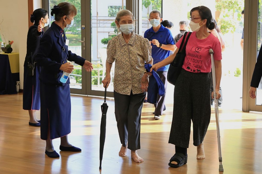 都是佛陀的教法,仪轨可能不一样,但精神理念是一致的。今年是年迈的黄银宋第一次参加慈济的浴佛典礼,她拄着雨伞,和右脚包着石膏的媳妇陈秋菊互相扶持,慢慢走入静思堂。原来,身为慈济志工的陈秋菊两个星期前不慎扭伤了右脚踝,导致行动不便。