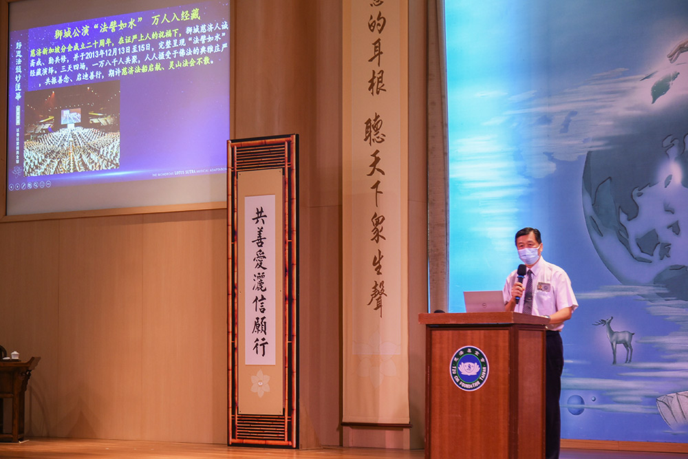大屏幕上也出现上一次殊胜法会的照片,那是在2013年慈济新加坡20周年庆时,在国家室内体育馆举行三天四场的“法譬如水”经藏演绎。陈昭云说,当时上人因应社会乱相,重新讲述《慈悲三昧水忏》,开启忏悔法门,引领大家明因识果,虔诚发露忏悔,洗涤内心无明;近十年后的今天,则启动“静思法髓妙莲华”经藏演绎,期盼大家法入心、法入行,传承静思法脉,弘扬慈济宗门。