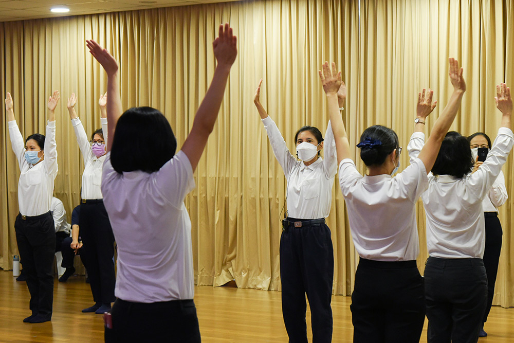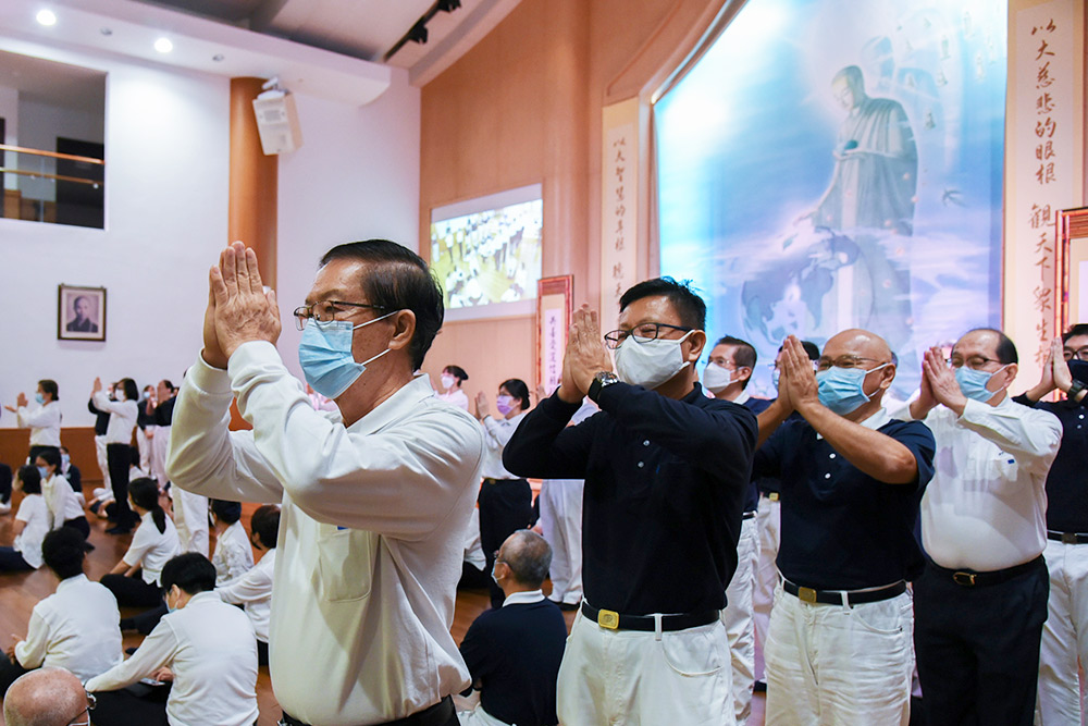 “无上甚深微妙法,百千万劫难遭遇,我今见闻得受持,愿解如来真实意……”新加坡静思堂里,志工和民众随着词曲节奏,齐声唱诵和比划,心口合一,进退有序。在逐渐熟练和整齐的队伍中,两位负责经藏演绎教学的大种子邱秉柔(懿可)和陈伟豪(诚豪)喊着“右、并、右、并,转身“的口令,耐心指导入经藏手势动作和队形变化。