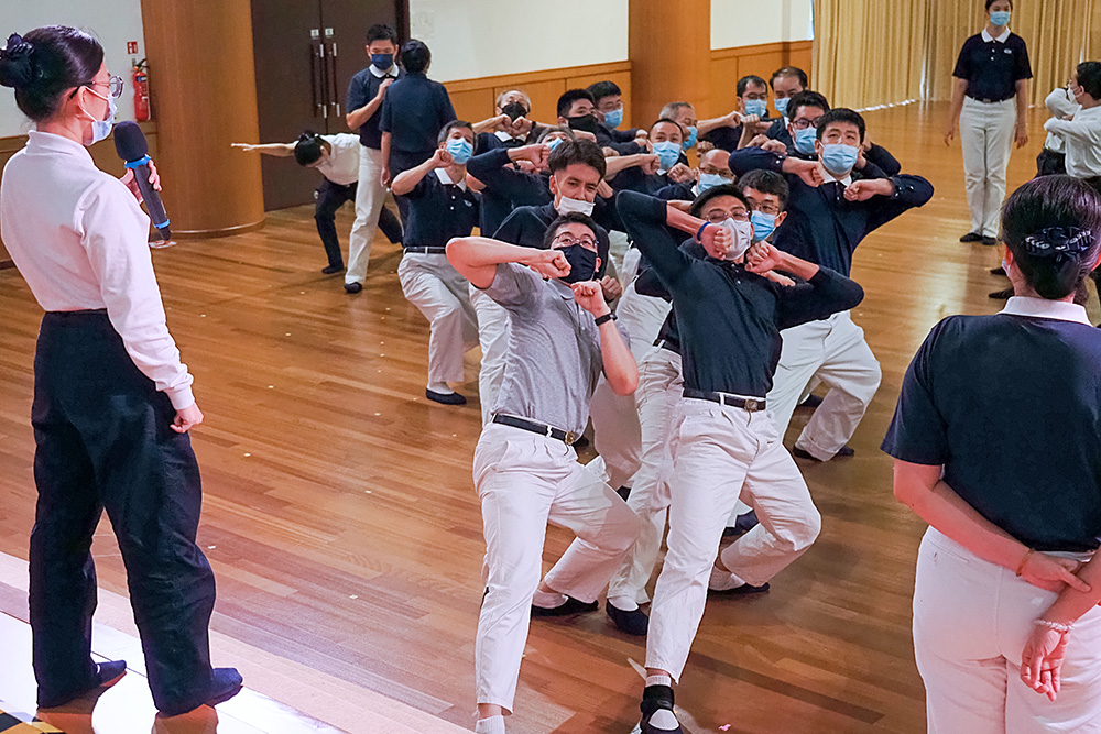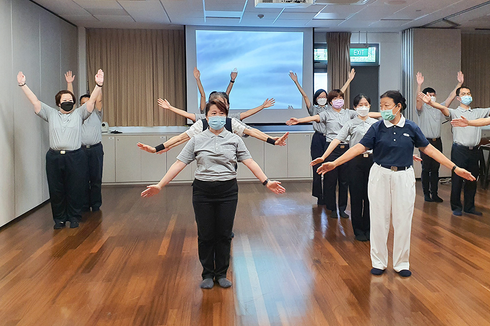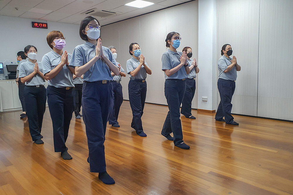 位于岛国北部的中医义诊中心职工,就联同两位西医部职工,趁午休空档练习;而两所幼教中心职工是趁每周五下班后的时段,紧锣密鼓排练。静思堂职工则是每周星期一、三、五,于午休的半小时空档练习。对很多参与过经藏演绎的职工来说,像今天这般反复微调姿势和表情,都是入经藏必经的“化城”。