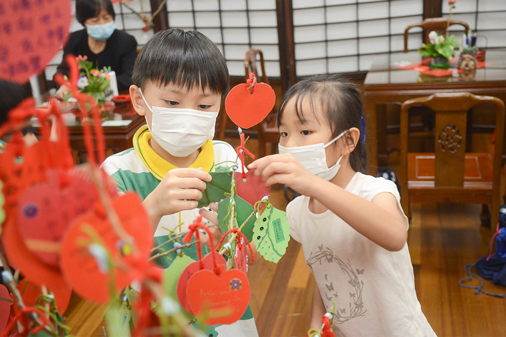 小朋友小心翼翼地将写好的祈福卡挂在祈福树上。(摄/ 蔡振加)