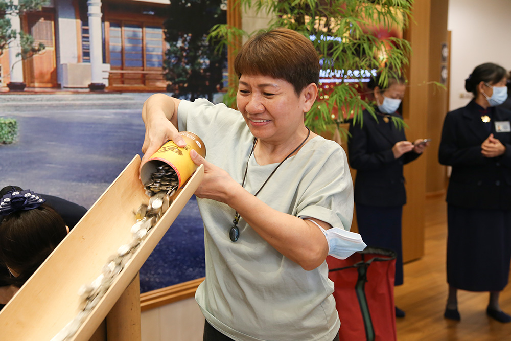 会众吴宝莉是慈济会员,年年带着竹筒回娘家。这次她带着十个竹筒,花了好一会才把竹筒全数倒进功德海。“这是来自四个家庭,其中有六个是我家的。”吴宝莉说,几年前自己身体出了状况,心情极度低落时,志工蔡好乐的关怀与接引,让她逐渐心开意解。
