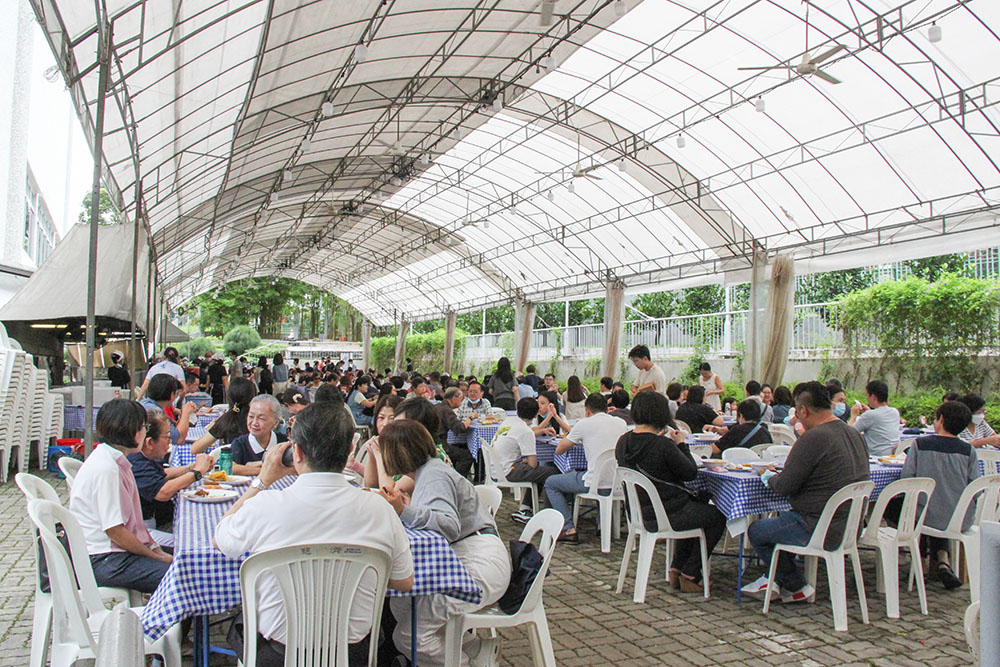 静思堂后方设有供斋区及推素站,志工准备丰盛的素食与会众结缘。(摄/ 李兰贞)