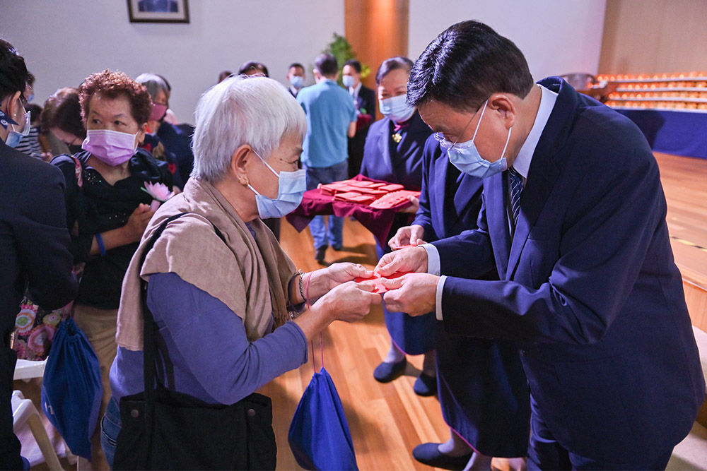 执行长刘瑞士(右)派发福慧红包予民众,祝福大家年年福慧双修。(摄/ 黄建兴)