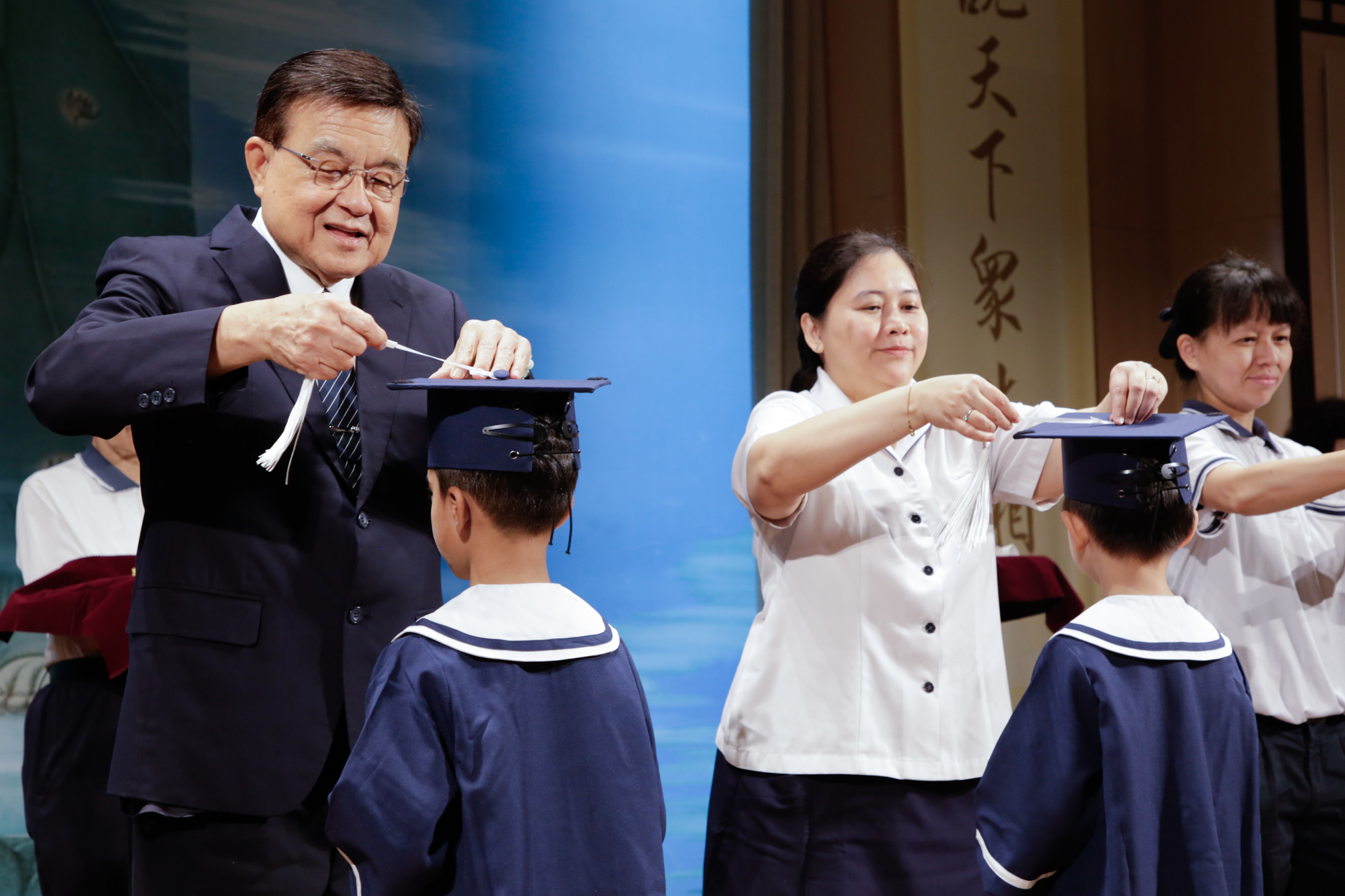 毕业生依次走上台,师长轻轻地为毕业生拨穗,象征着祝福与期望,期盼毕业生如饱满的稻穗般,越成长越谦和。随后毕业生转身面向台下,向父母深深一鞠躬,父母脸上随即绽放出欣慰而骄傲的笑容。