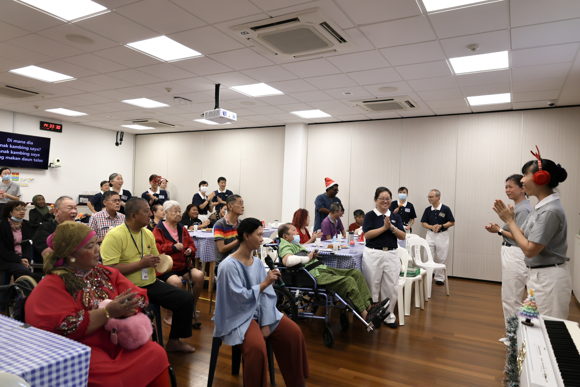 破冰环节,主持人带领大家玩互动游戏,课室中笑声、掌声不断。随后,众人齐唱耳熟能详的歌曲《Merry Christmas》《Chan Mali Chan》,也欢快地唱起童谣《三只老虎》。歌声流转间,节日的喜悦与人情的温暖悄然交融,沁满整个空间。