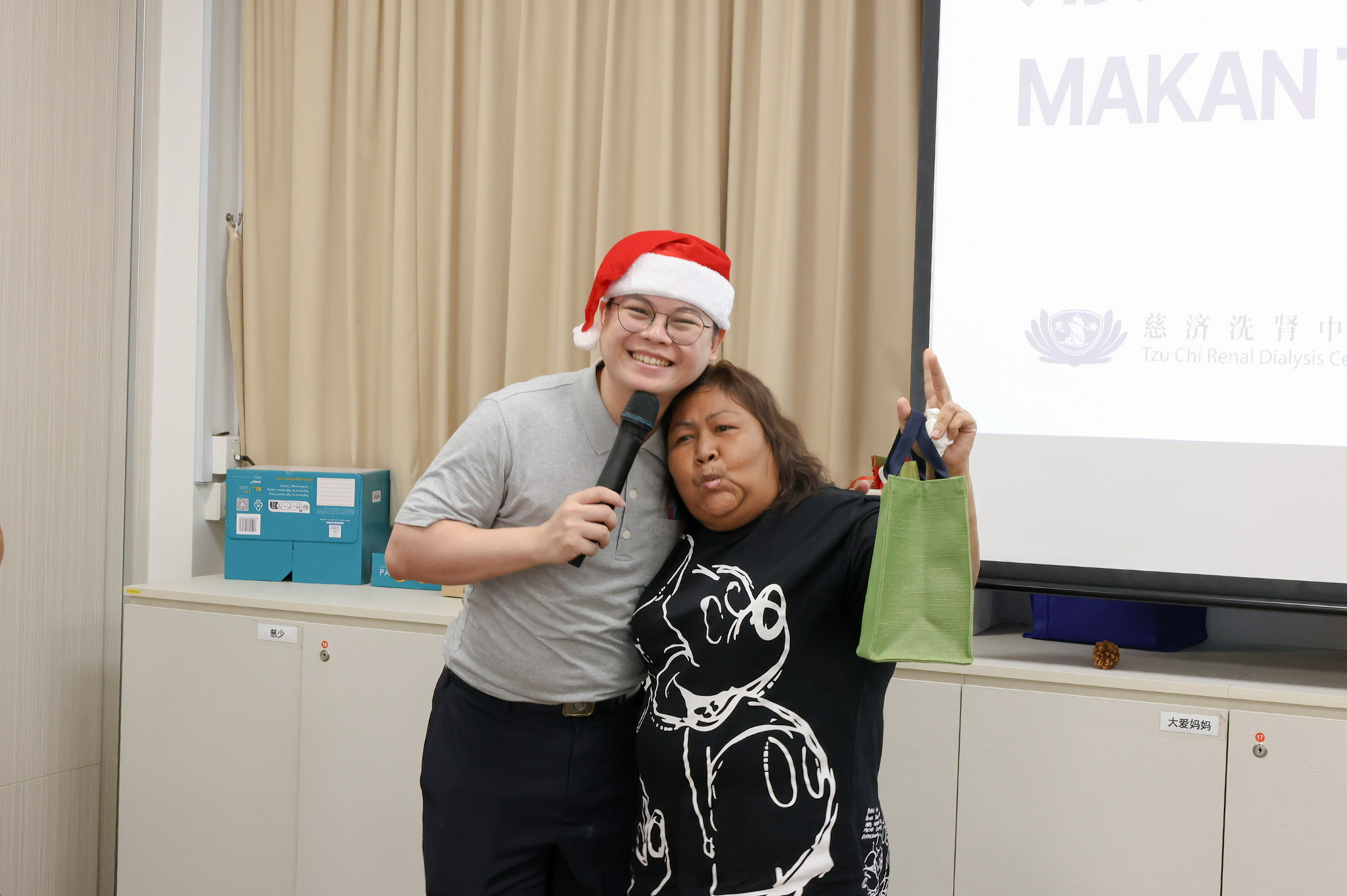 聚会当天,静思堂的圣诞装饰闪烁温暖,志工扮成的圣诞老人在门口热情相迎肾友的到来。肾友们有的拄着拐杖,有的由家人陪伴,虽行走缓慢,但每一步都走得郑重,每一张脸都带着笑意。
